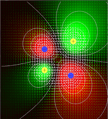 A 2-dimensional Electrostatics Applet. This one lets you move charges around and plots fields, potential difference (Voltage), equipotential lines. etc. as things move around. The picture above shows the fields, potential, and charge for a quadrupole (two positive and two negative charges).